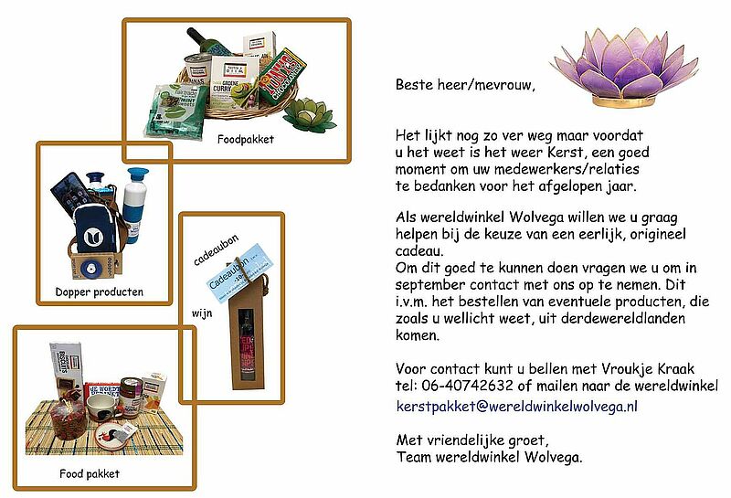Hieronder kunt u klikken om direct een email te versturen met uw vragen:Email: kerstpakket@wereldwinkelwolvega.nl