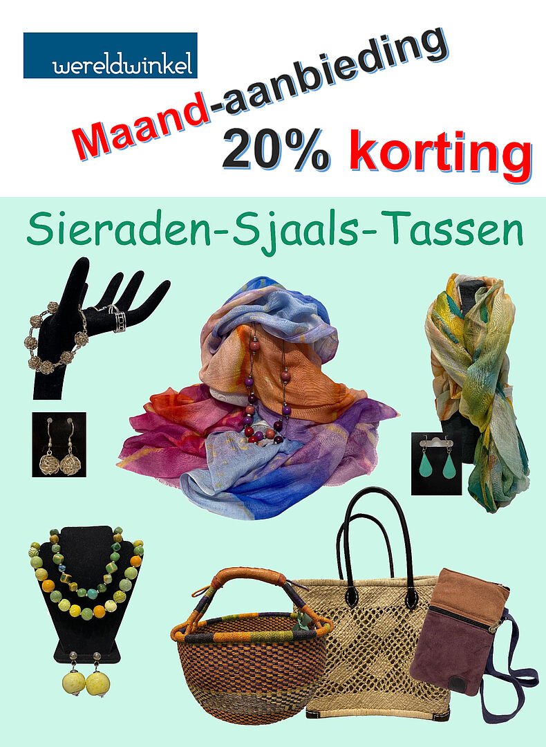 Deze maand is alle sieraden, sjaals en tassen in onze winkel met 20% korting in de aanbieding.